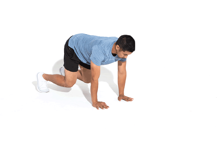 Start in a pushup position with the right leg extended backward and the left leg near the chest with the toes on the ground.