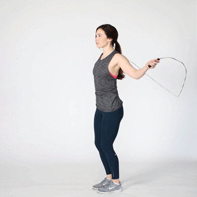 Stand with the feet together and jump up and down while swinging the arms in a circular direction.