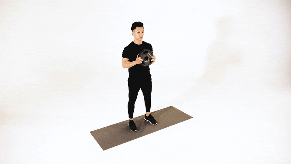 Return the right foot to the starting position and repeat for 10 lunges on one side.